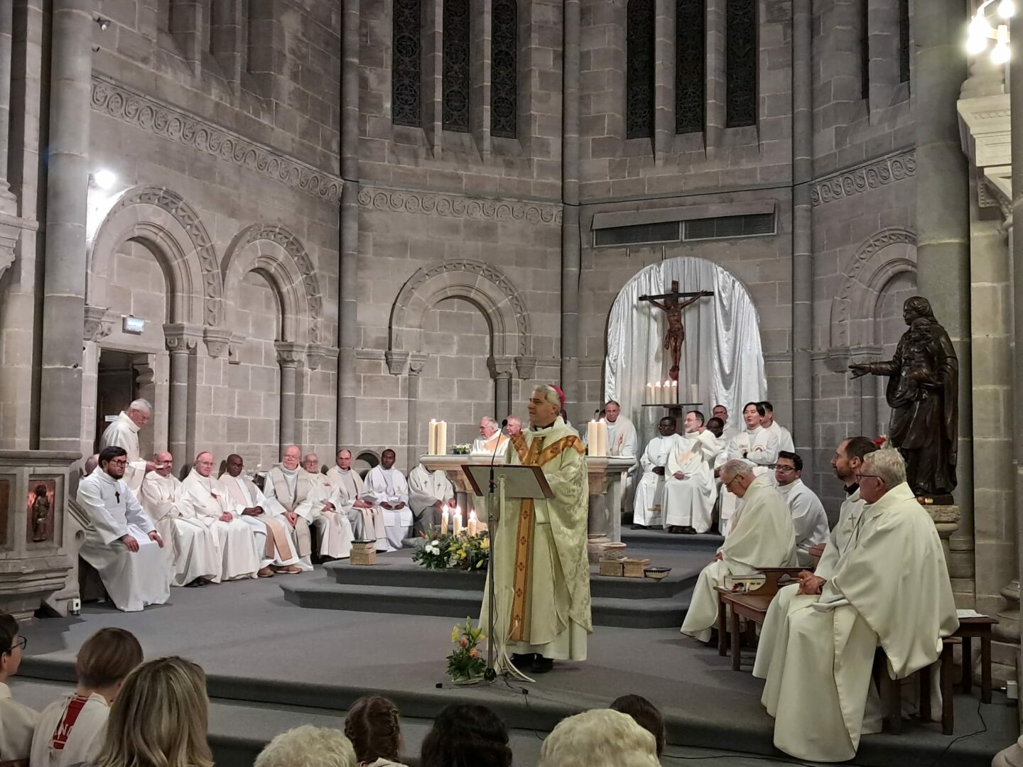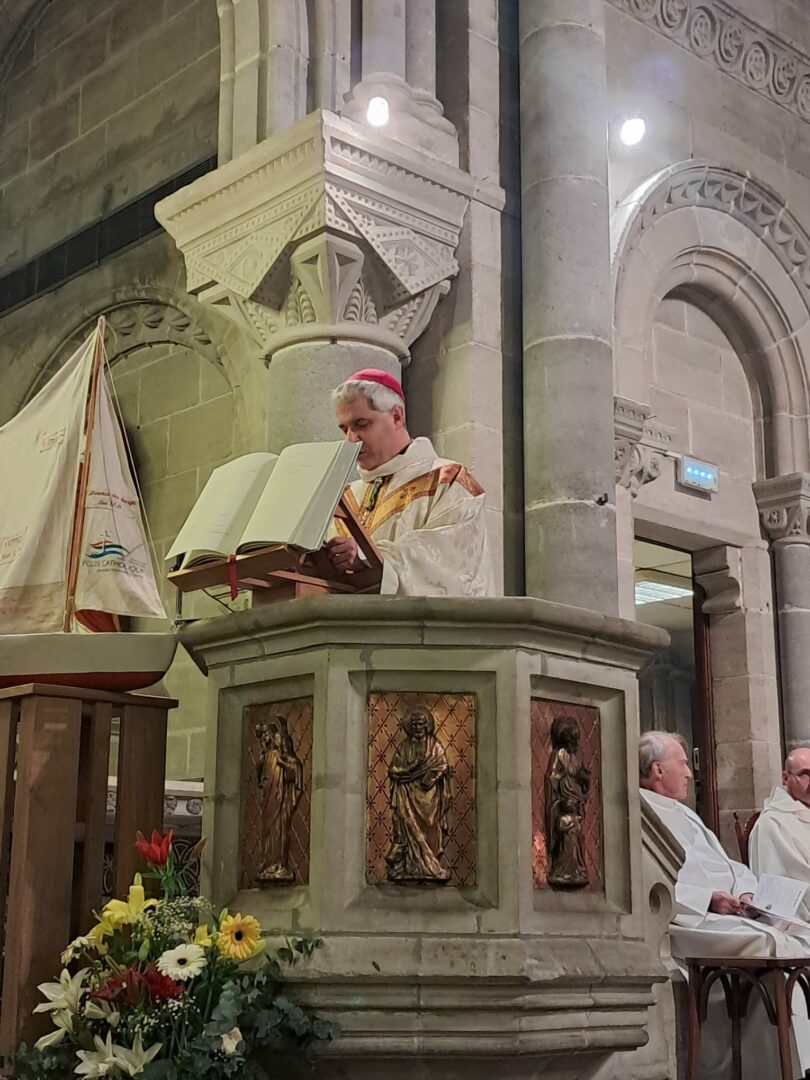 Dans son homélie, Mgr Jachiet nous a invités à méditer la joie dans la vie de Saint Paul sous trois aspects : la joie d’appartenir au Christ, la joie de faire partie de l’Église, la joie de porter l’Évangile au monde. Il a souligné que « Cette même joie nous est offerte même si nous ne vivons pas d’évènement comparable à la conversion de Saul. En effet par notre Baptême, même ancien et sans souvenir précis, nous avons été saisis par le Christ. Là et la source de notre joie la plus authentique, et la plus solide, celle nous permet de dire en toute circonstance : j’appartiens à Jésus-Christ ! ».