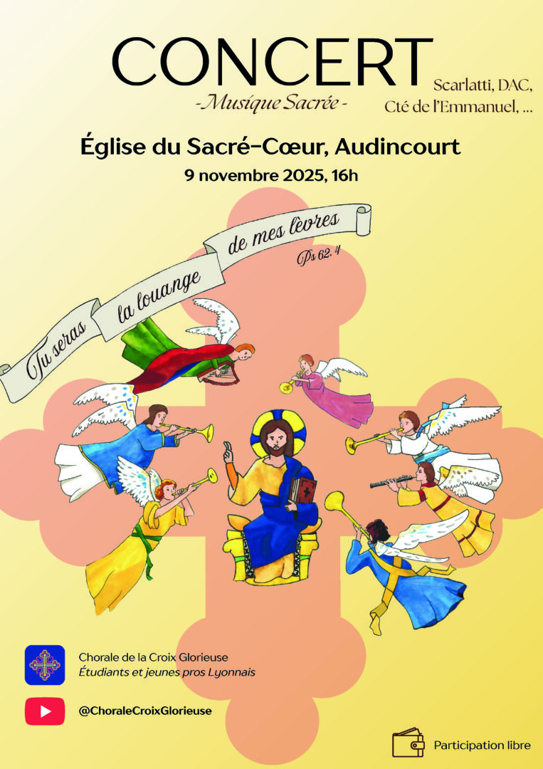 La Chorale de la Croix Glorieuse de Lyon vous invite chaleureusement à leur concert inspiré du verset du Psaume : « Tu seras la louange de mes lèvres » (Psaume 62, 4) », le 9 novembre 2026 en l’église du Sacré-Cœur d’Audincourt à 16h.