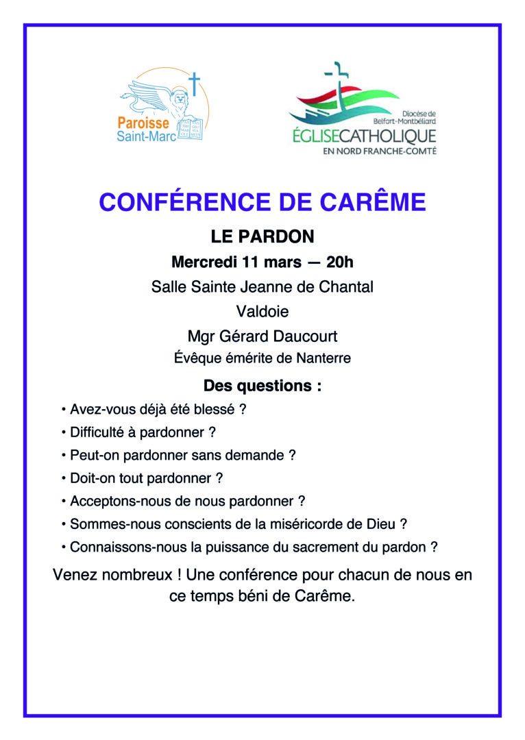 La paroisse Saint-Marc vous invite à une conférence de Carême sur le thème du pardon, mercredi 11 mars à 20h, salle Sainte Jeanne d’Arc à Valdoie.
