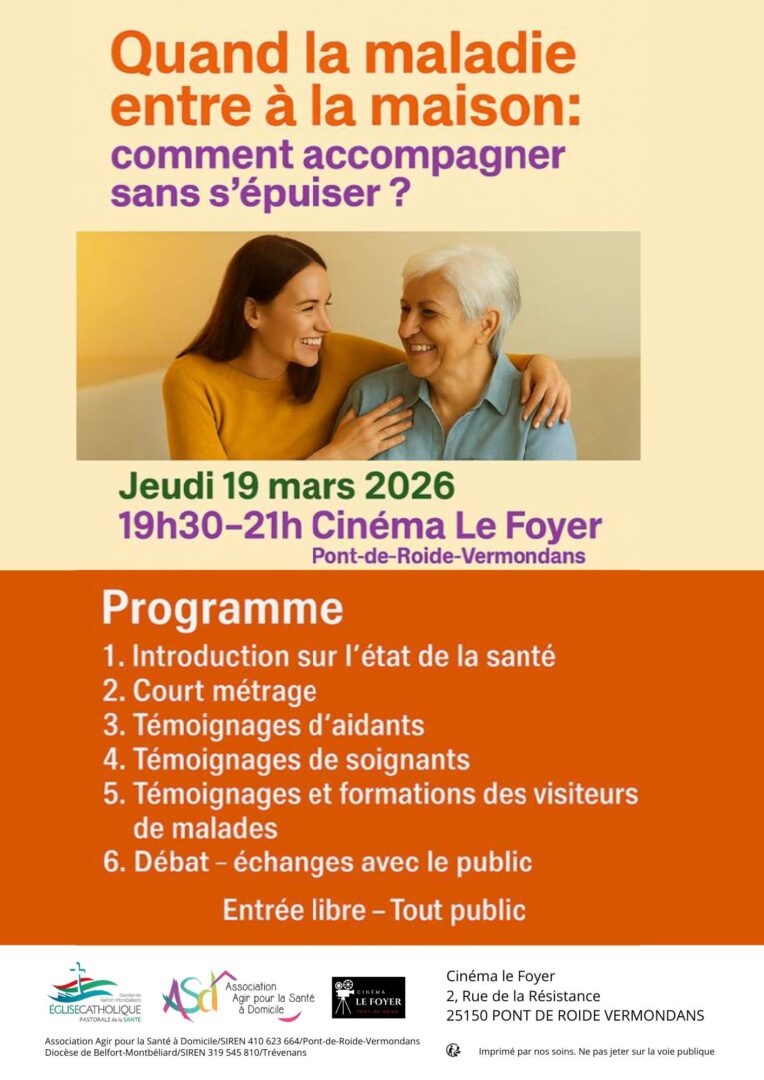 La Pastorale de la Santé et l’Association Agir pour la Santé à Domicile vous invitent à une conférence-débat ouverte à tous, au cinéma Le Foyer, autour de ces questions qui concernent chacun d’entre nous, aujourd’hui ou demain.