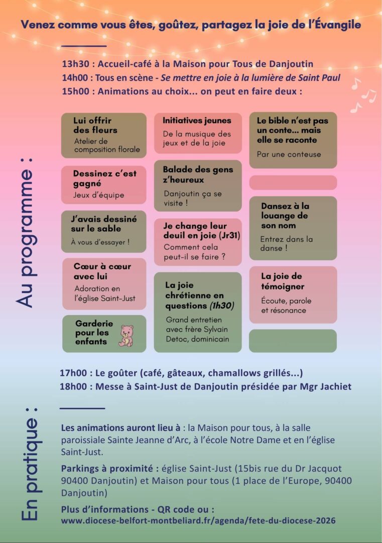La fête du diocèse aura lieu à Danjoutin au sein du doyenné de Chèvremont, le 24 janvier 2026 à partir de 13h30. Avec le thème « Mets ta joie dans le Seigneur ! » nous serons guidés à la découverte du mystère de la joie chrétienne.
