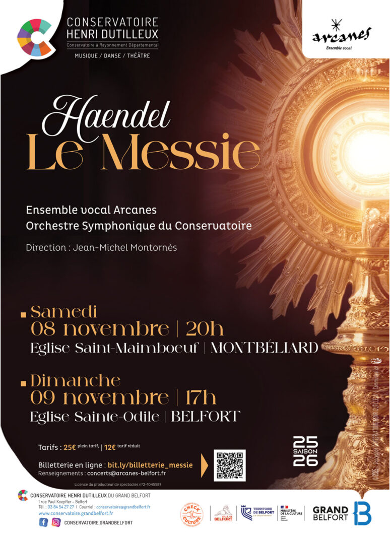 Samedi 8 novembre 2025 à 20h à Montbéliard et dimanche 9 novembre 2025 à 17h, à Belfort, l’Ensemble vocal Arcanes et l’Orchestre symphonique du Conservatoire de Belfort invitent le public à (re)découvrir Le Messie de Georg Friedrich Haendel, l’un des chefs-d’œuvre les plus emblématiques du répertoire sacré baroque.