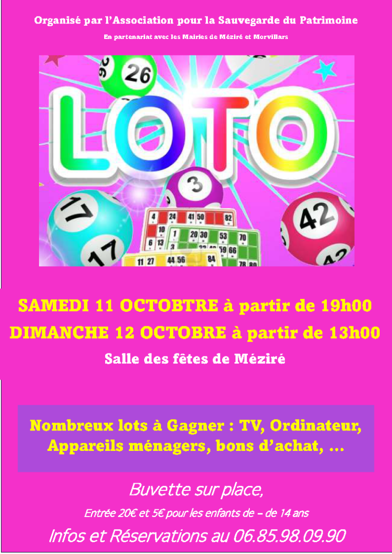 L’église Saint-Martin de Morvillars, témoin de notre histoire et de notre vie de village, a besoin de nous pour retrouver toute sa beauté. Pour contribuer à sa restauration, l’Association pour la Sauvegarde du Patrimoine, en partenariat avec les mairies de Méziré et de Morvillars, vous invite à un grand loto solidaire !