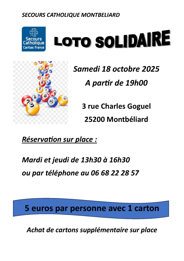 Le Secours Catholique de Montbéliard vous invite à son loto solidaire le samedi 18 octobre 2025 à 19h00 dans ses locaux, 3 rue Charles Goguel à Montbéliard.