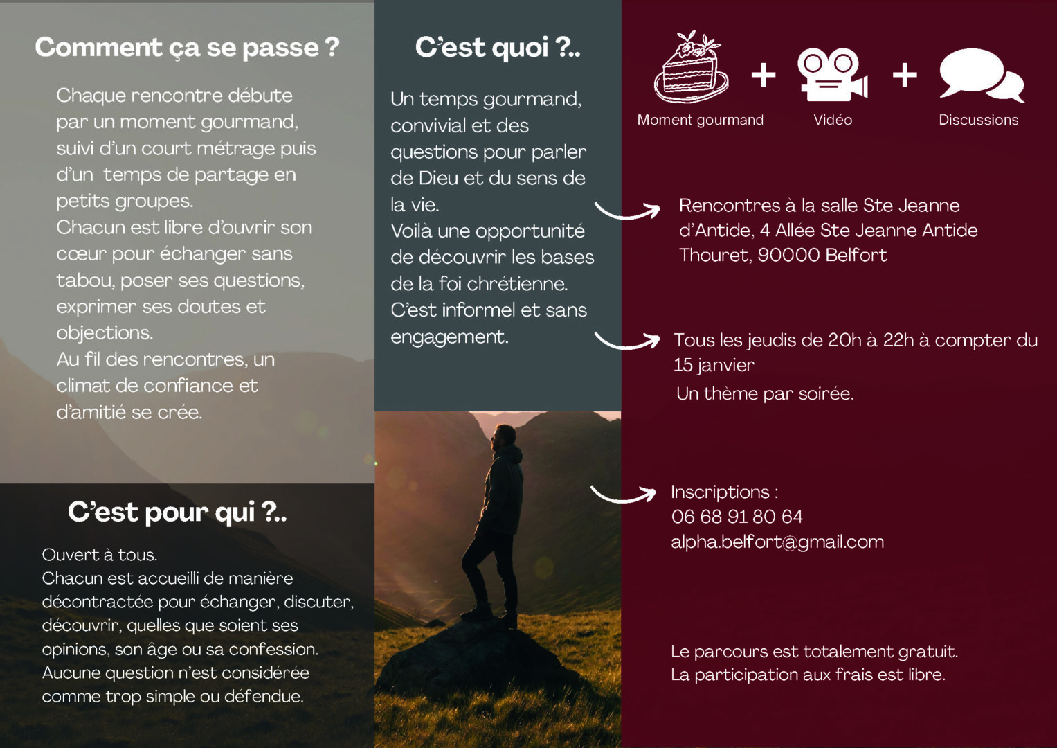 Nous vous offrons l’inscription au parcours gratuitement. Nous vous demandons une simple inscription par mail afin de vous offrir le meilleur accueil à : alpha.belfort@gmail.com