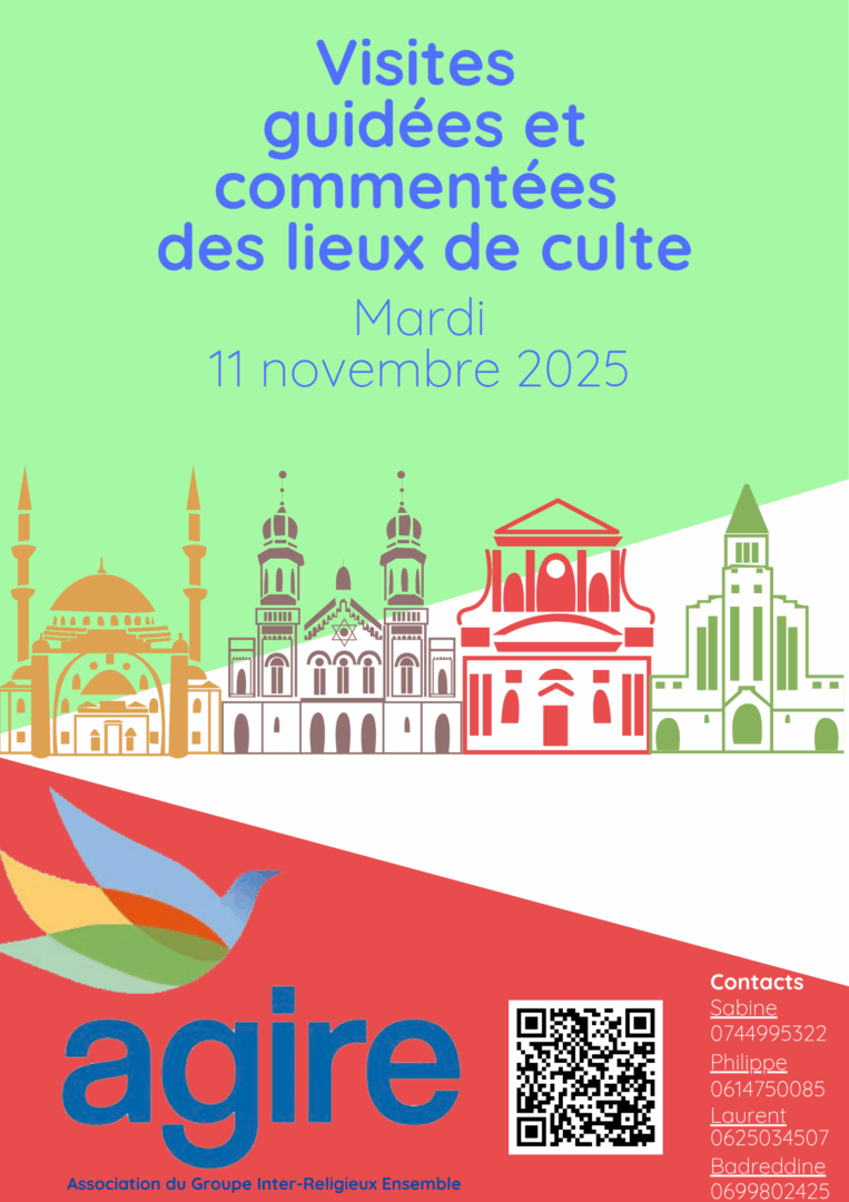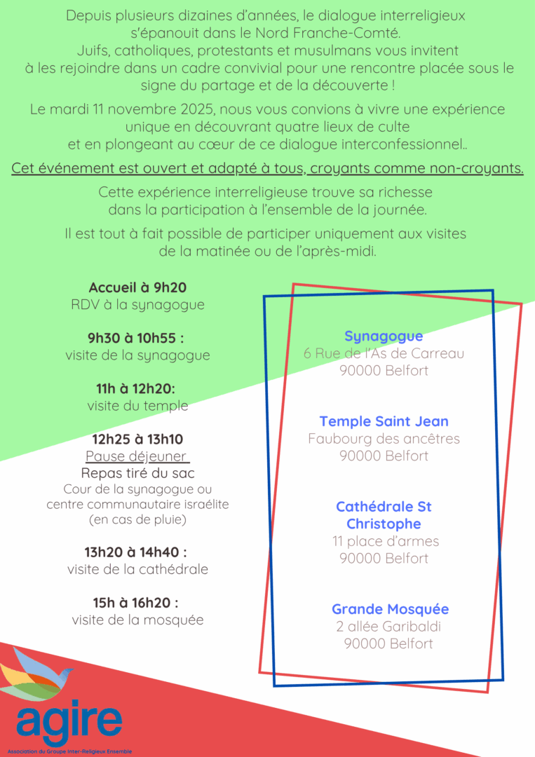Le 11 novembre 2025, l’AGIRE propose à toutes personnes de vivre ce dialogue interreligieux entre frères juifs, catholiques, protestants et musulmans en participant à la visite des quatre lieux de cultes : la synagogue, la cathédrale St Christophe, la grande mosquée et le temple Saint-Jean, à Belfort.