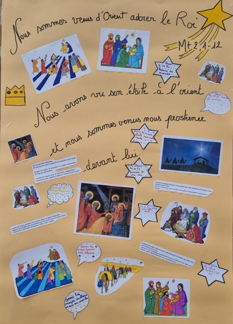 Dès le début de son homélie Frère Benjamin invitait l’assemblée à regarder le panneau illustrant le texte de l’Evangile de Matthieu. Lors de l’atelier bricolage, les enfants ont porté leur réflexion et se sont exprimés sur le sens qu’ils souhaitaient donner à cette fête de l’Epiphanie. Ils ont ainsi retranscrit leur définition et évoqué de quelle façon ils pouvaient ressembler aux mages.