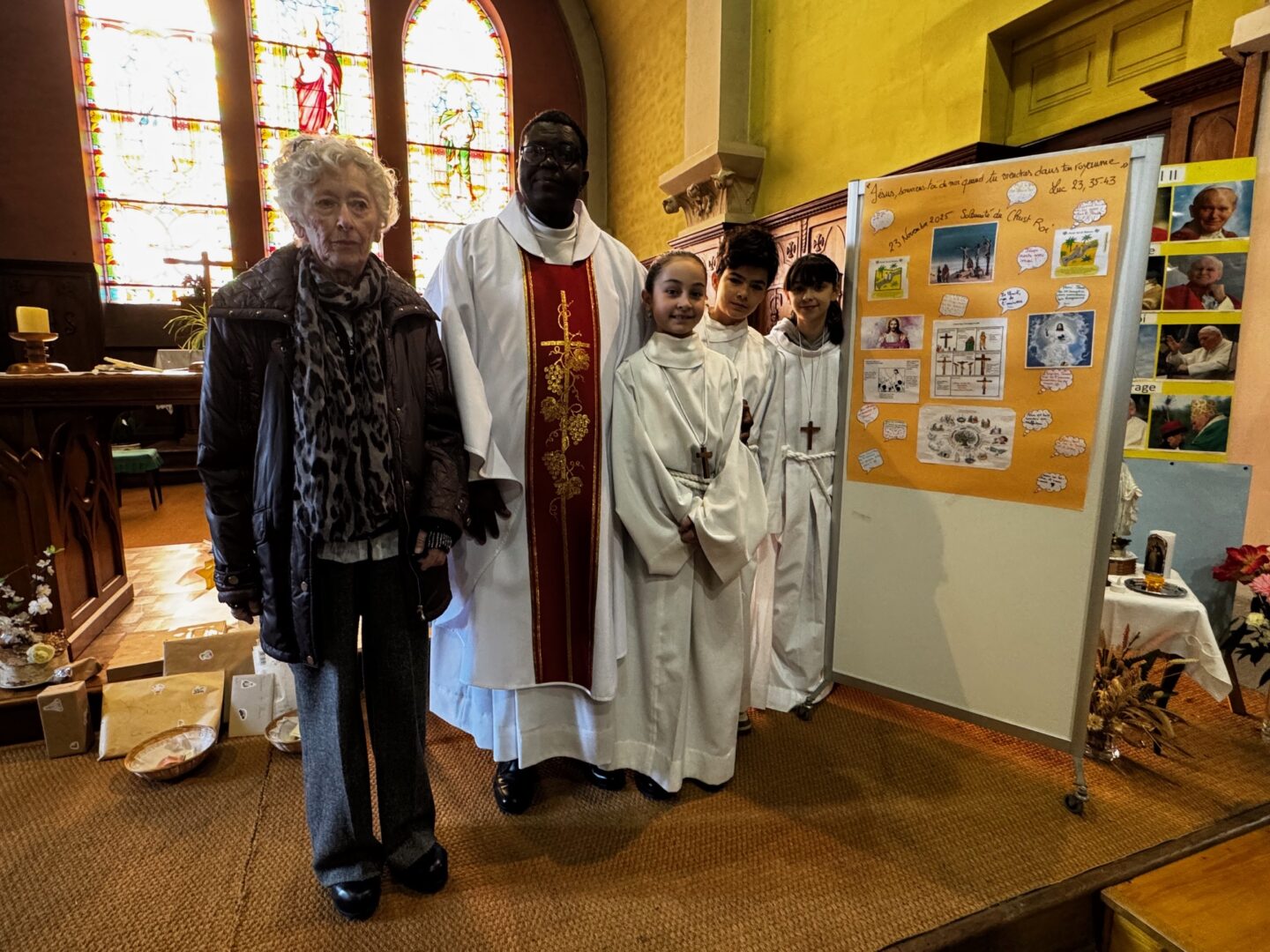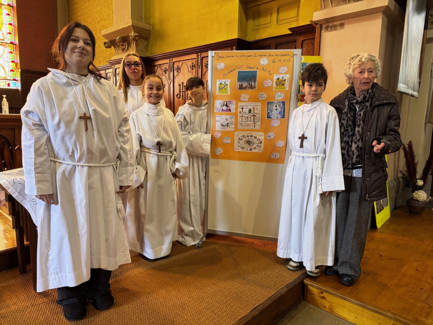 L’année liturgique C se termine. En ce dimanche de la solennité du Christ-Roi notre messe des familles avait lieu à l’Eglise St Pierre de Dampierre les Bois. Les enfants du Kt ainsi que Lilou et Clémence nos jeunes catéchumènes entouraient Frère Benjamin.