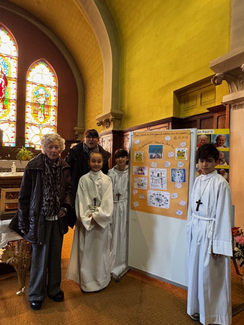 A l’initiative de Frère Benjamin, les petits de l’éveil à la foi étaient présents et, entourés de leurs parents, ont présenté leurs dessins traduisant, à leur niveau, la compréhension des paroles de Jésus. Les cœurs exprimant l’amour porté à Jésus, et le soleil, l’espérance.