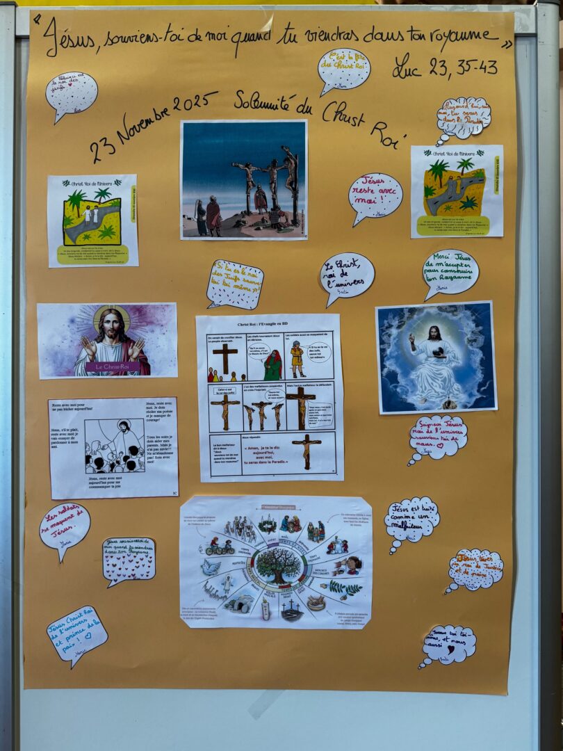 Au cours de la préparation de cette messe les enfants, guidés par les catéchistes, ont porté leur réflexion sur cette scène de l’Evangile où Jésus est traité comme un malfaiteur, et en ont relevé les mots-clés : « Sauve-toi toi-même et nous aussi », « Aujourd’hui, avec moi, tu seras dans le paradis » Ils ont aussi fait le rapprochement avec certaines situations, demandant comme le bon larron à Jésus de les accompagner « Seigneur Jésus roi de l’univers, souviens-toi de nous », « Merci Jésus de m’accepter pour construire ton royaume »