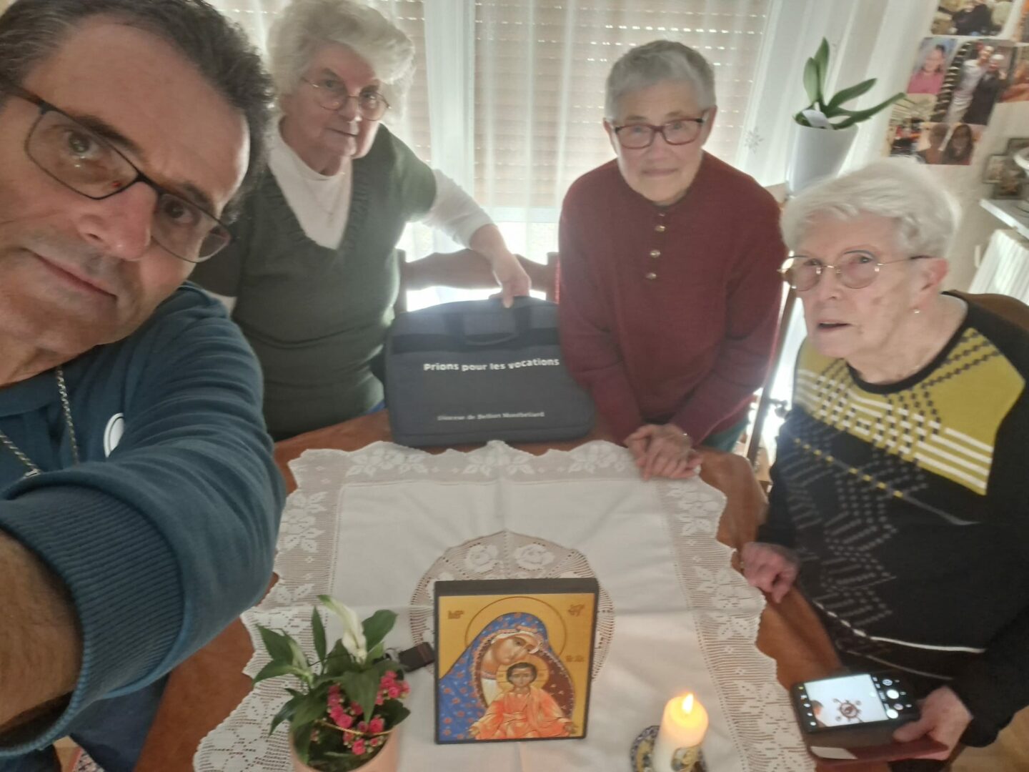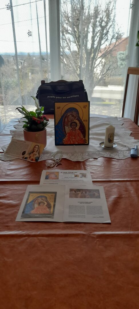 Frère Benjamin nous a remis, à Geneviève, Evelyne, Stéphane et moi-même, une valise contenant trois icônes de Marie et de l’Enfant Jésus, nous confiant, par là même, l’intention de prière pour les vocations.