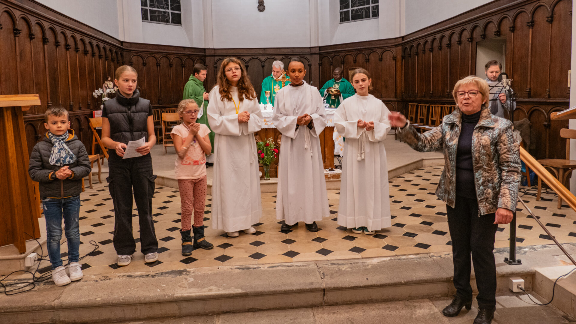Vendredi 1er Novembre, solennité de la Toussaint à Voujeaucourt, église Saint-Michel, les enfants déguisés en Saint Jean Paul II et Sainte Rita