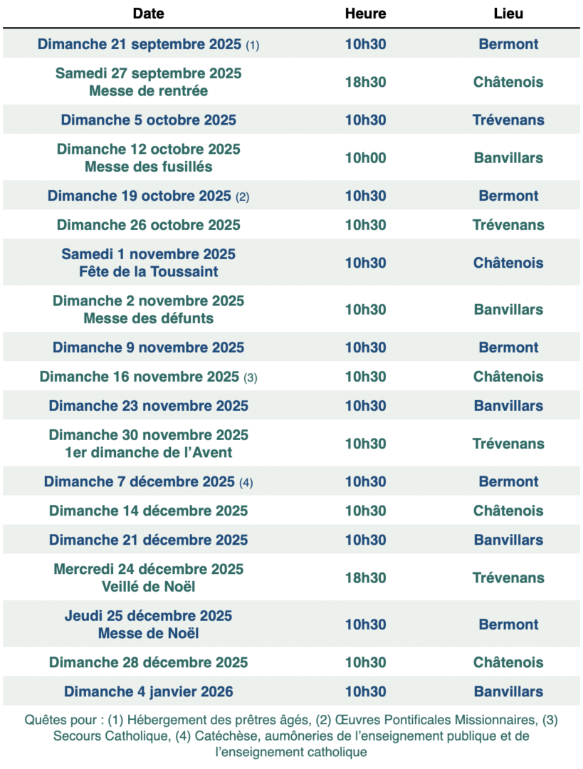 Je recherche Dans le site Un horaire de messe Dans l'annuaire Ma commune Commune Abbévillers Accolans Aibre Allenjoie Allondans Andelnans Angeot Anjoutey Appenans Arbouans Arcey Argiésans Audincourt Autechaux-Roide Autrechêne Auxelles-Bas Auxelles-Haut Badevel Bart Bavans Bavilliers Beaucourt Belfort Centre Belfort Le Mont Belfort Miotte-Forges Belfort Résidences-Pépinière Belverne Berche Bermont Bessoncourt Bethoncourt Bethonvilliers Beutal Bief Blamont Blussangeaux Blussans Bondeval Boron Botans Bourg-sous-Châtelet Bourguignon Bournois Bourogne Brebotte Bretagne Bretigney Brevilliers Brognard Buc Chagey Châlonvillars Chamesol Champey Charmois Châtenois les Forges Chaux Chavanatte Chavanne Chavannes les Grands Chèvremont Coisevaux Colombier Fontaine Courcelles Courcelles les Montbéliard Courmont Courtelevant Couthenans Cravanche Croix Cunelières Dambelin Dambenois Dampierre les Bois Dampierre sur le Doubs Dampjoux Danjoutin Dannemarie Dasle Delle Denney Désandans Dorans Dung Echenans Echenans sous Mont Vaudois Ecot Ecurcey Eguenigue Eloie Errevet Essert Etouvans Etrappe Etueffont Etupes Evette Salbert Exincourt Faimbe Faverois Faymont Fêche l'Eglise Felon Fesches-le-Châtel Feule Florimont Fontaine Fontenelle Foussemagne Frais Froidefontaine Gemonval Geney Giromagny Glay Glère Goux les Dambelin Grand Charmont Grandvillars Grosmagny Grosne Héricourt Hérimoncourt Hyémondans Issans Joncherey L'Isle sur le Doubs La Prétière Lachapelle sous Chaux Lachapelle sous Rougemont Lacollonge Lagrange Laire Lamadeleine val des Anges Lanthenans Larivière Le Vernoy Lebetain Lepuix Lepuix Neuf Leval Liebvillers Lomont Longevelle sur Doubs Lougres Luze Mancenans Mandeure Mandrevillars Marvelise Mathay Médière Menoncourt Meroux Meslières Méziré Montancy Montbéliard Montbouton Montécheroux Montenois Montjoie le Château Montreux-Château Morvillars Moval Neuchatel Urtière Noirefontaine Nommay Novillard Offemont Onans Perouse Petitcroix Petitefontaine Petitmagny Phaffans Pierrefontaine les Blamont Pont de Roide - Vermondans Présentevillers Rang Raynans Réchésy Recouvrance Rémondans - Vaivre Reppe Riervescemont Roches les Blamont Romagny Roppe Rougegoutte Rougemont-le-Château Saint Dizier l'Evêque Saint Germain le Châtelet Saint Hippolyte Saint Julien les Montbéliard Saint Maurice Colombier Sainte Marie Sainte Suzanne Saulnot Seloncourt Semondans Sermamagny Sévenans Sochaux Solemont Soulce Cernay Sourans Soye St Dizier l'Evêque Ste Marie Suarce Taillecourt Tavey Thiancourt Thulay Trémoins Trévenans Urcerey Valdoie Valentigney Vandoncourt Vaufrey Vauthiermont Véllescot Verlans Vescemont Vétrigne Vézelois Vieux Charmont Villars les Blamont Villars sous Dampjoux Villars sous Ecot Villars-le-Sec Villers-sur-Saulnot Voujeaucourt Vyans le Val