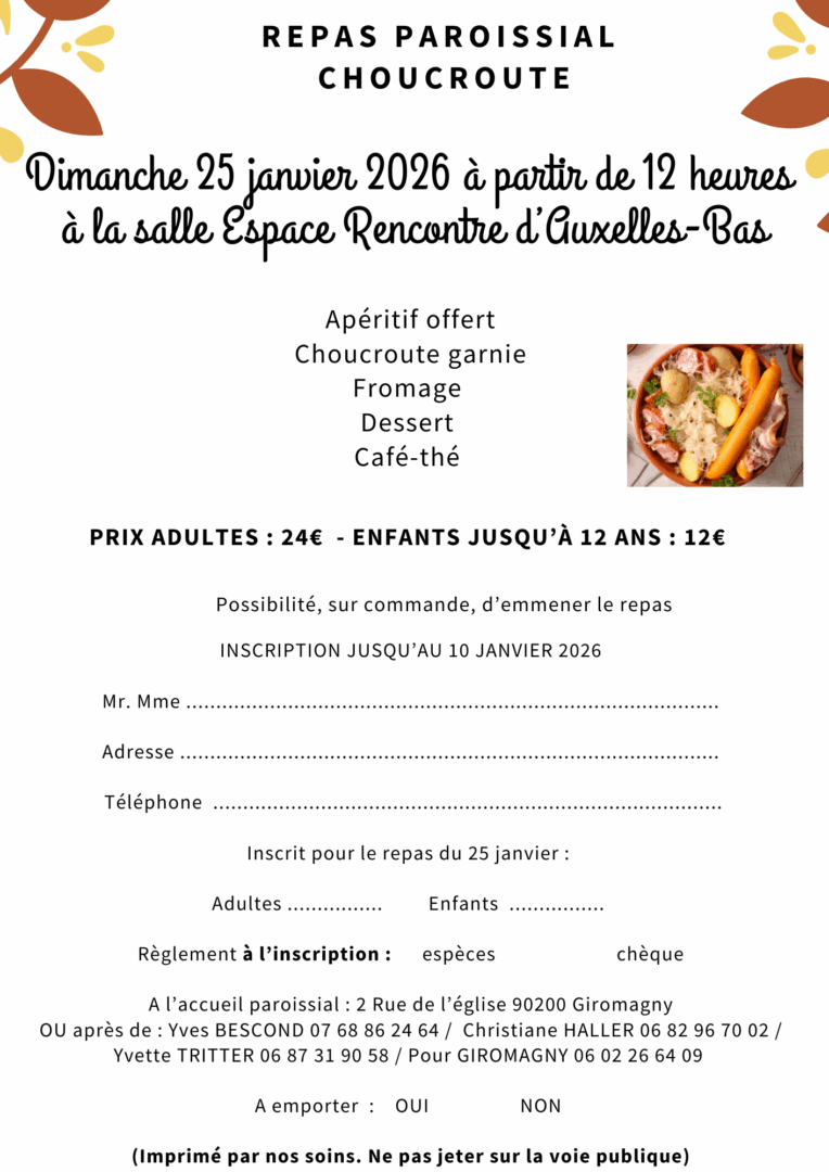 Repas paroissial Giromagny - Rougemont Partager Sur Facebook Sur Twitter Sur Linkedin Sur Whatsapp Par Email Giromagny - Rougemont Sainte Famille Actualités Repas paroissial Publié le 26 décembre 2025