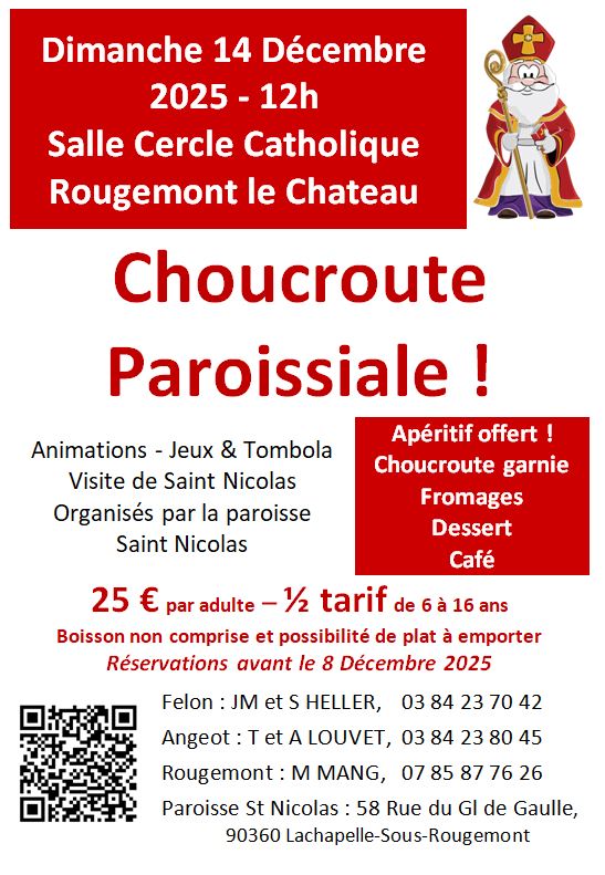 Choucroute à partir de 12h à la salle du Cercle Catholique de Rougemont le Chateau puis après-midi festive, familiale et conviviale.